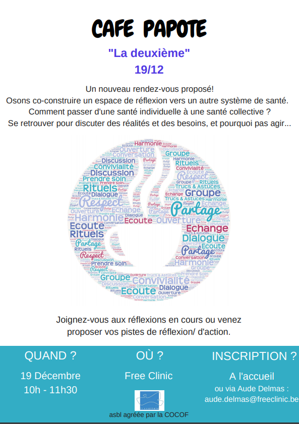 La Free Clinic vous convie à son deuxième "Café Papote" le mercredi 19/12 de 10h à 11h30. Ouvert à tous