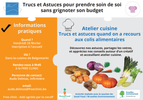 Le 23/02 nous vous invitons à un atelier cuisine dont l’objectif est d’essayer de concilier au mieux colis alimentaires et santé.