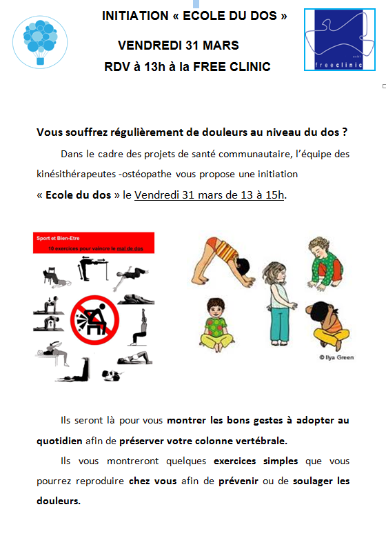 Initiation "école du dos" à la Free Clinic le vendredi 31 mars de 13 à 15h