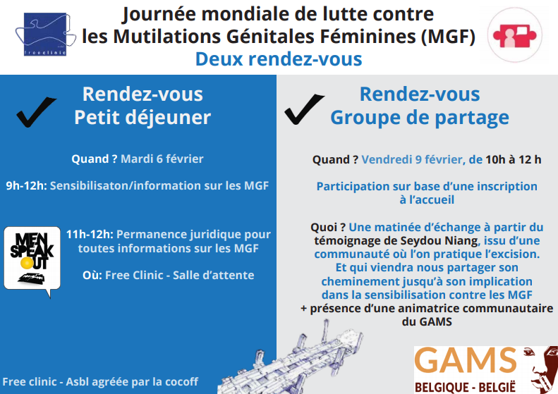 Dans le cadre de la journée mondiale de Lutte contre les Mutilations Génitales Féminine, la Free Clinic vous invite à 2 événements.